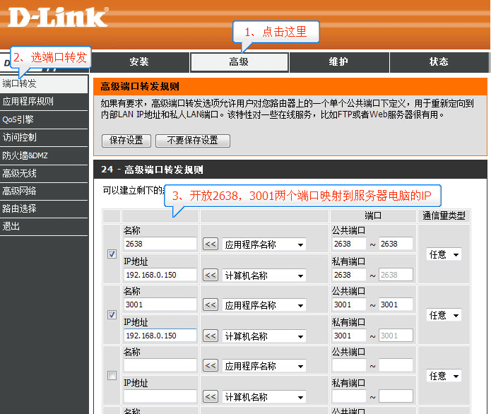 進去路由器后,點擊左側“轉發規則”---“虛擬服務器”,添加端口,如2638,IP地址為服務器端電腦的IP,如這里是192.168.1.150,協議ALL,代表所有的通過,后面要選用啟用,這樣當外部網絡請求該端口時自動將該請求轉到所設置IP的電腦上,需要注意的事項,安全設置里面有一個“高級安全設置”中的“忽略來自WAN口的Ping”一定不要選中,否則外部不能連接,該功能的意思是當外部請求時自動放棄。
