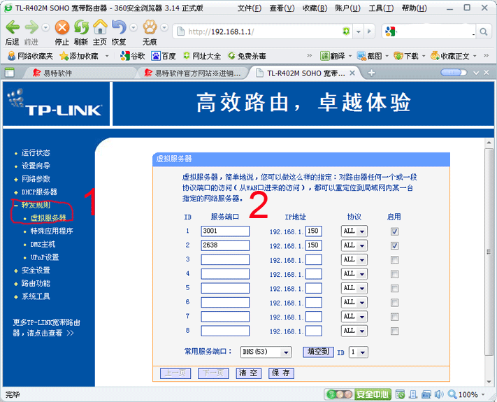 下圖為TP-LINK的路由器設置方法。(開放端口時,請一定選兩種類型均開放,有的顯示TCP/UDP,ALL,任意等,如果只開放了TCP,則會提示無法連接數據庫,因為數據庫需要雙向通信交互)